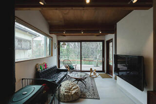 弊社ショールーム/椅子の後ろのタイルは3m×1.5mの大判タイルです。